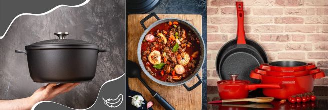 • Material en aluminio fundido a presión: Para hacerlos más resistentes, livianos, y fáciles de manipular. Garantiza una distribución uniforme del calor, lo que evita los puntos calientes y promueve resultados de cocción perfectos.