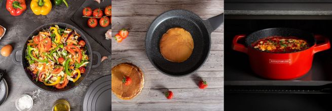 La batería de cocina Royalty Line está fabricada en aluminio fundido a presión y revestimiento en mármol, garantizando una distribución uniforme del calor y efecto antiadherente para platos perfectamente preparados. Además es compatible con cocinas a gas, eléctricas, cerámica y de inducción, que le permite ser una opción esencial para cualquier cocina moderna. Ya sea que esté salteando, friendo o cocinando a fuego lento, cada olla y sartén ofrece una retención de calor excepcional y una transferencia de calor rápida y uniforme para obtener resultados de cocción óptimos.